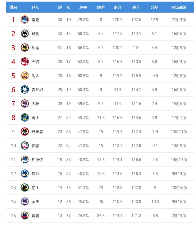 今日比赛后太阳、森林狼排名互换,其他西部球队排名不变。