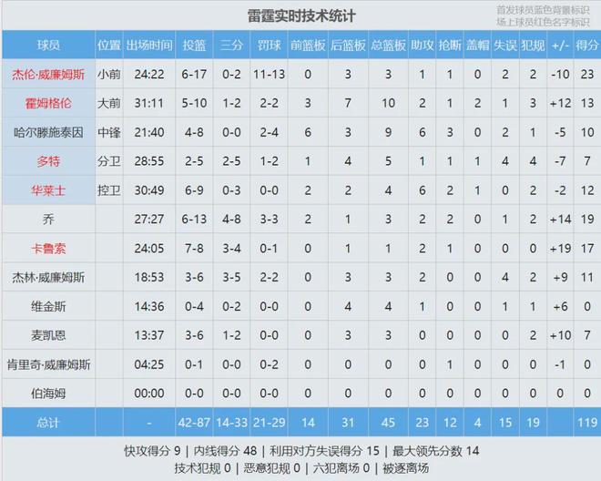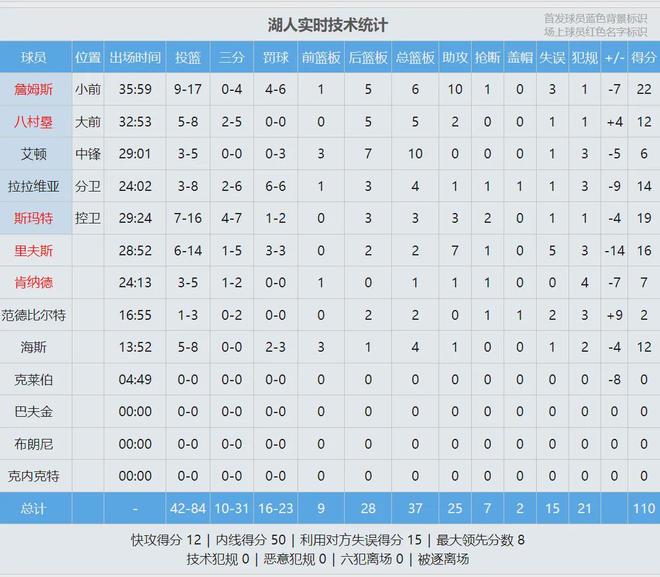 全场结束,湖人110-119不敌雷霆,明天湖人背靠背对阵西部第二的马刺。里夫斯首节4中4,后三节8中2,全场14中6砍下16分2篮板7助攻5失误。詹姆斯17中9,得到22分6篮板10助攻3失误。杰威得到23分,以赛亚-乔砍下19分。