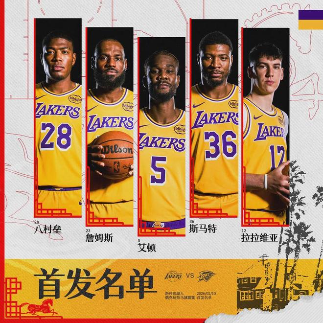 北京时间2月10日,NBA常规赛:湖人主场vs雷霆。东契奇和亚历山大因伤休战,雷霆二当家杰伦-威廉姆斯本场复出。截至今天赛前,雷霆40胜13负联盟第一,领先活塞只有0.5个胜场。湖人32胜19负西部第五,和第四的火箭持平。