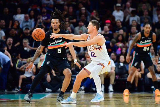 次节比赛,马刺连续两节单节得分30+,且限制太阳连续两节单节不超过25分。马刺继续压制太阳,文班亚马与科内特接连内线得分,马刺逐步扩大两位数领先优势。布克因为右髋部酸痛不到9分钟退赛,马刺单节31-24再赢7分,上半场结束马刺已经扩大61-49领先太阳。