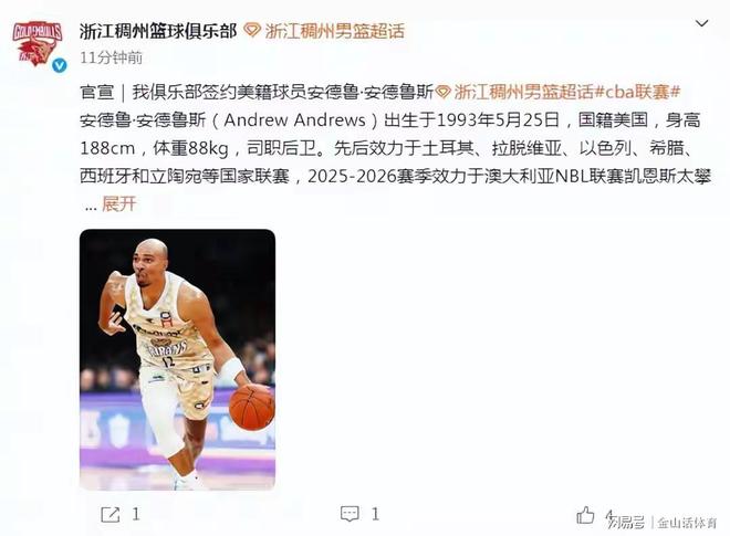 值得一提的是,在与约克解约后,浙江稠州金租男篮同时宣布,俱乐部已正式签约美籍后卫安德鲁·安德鲁斯,这位32岁老将,将代表浙江男篮出战2025-2026赛季剩余比赛。作为一名双能卫,安德鲁斯在效力澳大利亚NBL期间,场均贡献14.5分、2.4个篮板和5.8次助攻,其助攻数高居联盟第五位。从打法和个人特点来看,安德鲁斯既具备良好的人球结合突破能力,也有很强的得分能力,同时拥又具备组织串联能力。属于能突能投能传的全能型小外援。