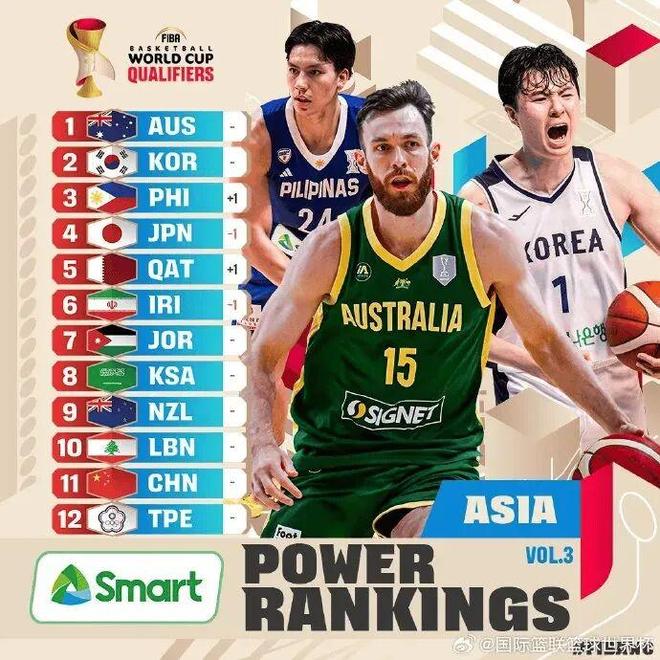 FIBA官方更新世预赛第二窗口期实力榜,其中,澳大利亚、韩国和菲律宾位居前三,中国男篮位居第11位,中国男篮即将对阵的日本排名第四。