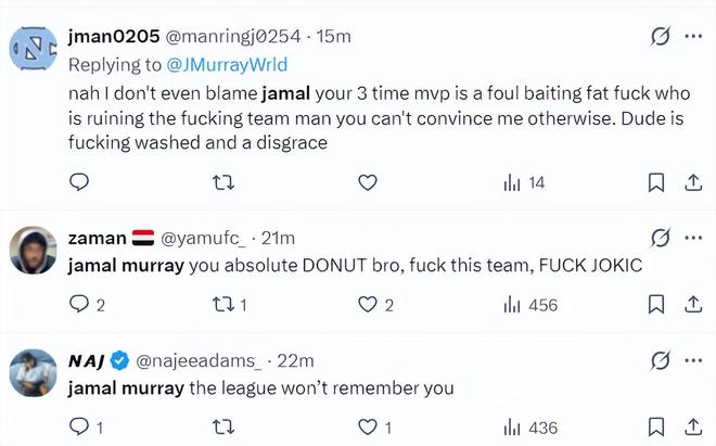 1.我觉得也不该全怪穆雷,三届MVP约基奇表现也很差,他在故意搞破坏,他也是NBA的一个耻辱;