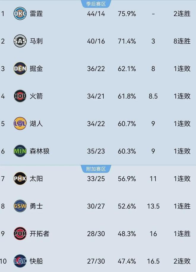 迄今为止快船取得了27胜30负战绩,排名西部第十,落后第六的森林狼7.5个胜场,领先第11的灰熊5个胜场,基本无缘直通季后赛可大概率锁定了一个附加赛名额。
