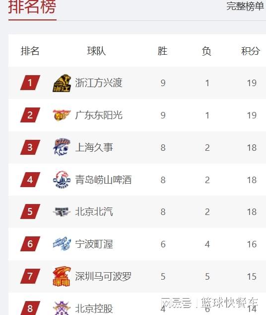 11冠王广东队,上一轮比赛大比分输给了北京队,他们遭遇到新赛季首败。不过,在结束8连胜之后,广东队这一战面对北控队,他们最终还是顶住压力,以微弱的优势险胜对手,成功拿下赛季第9胜。广东队目前的战绩也是9胜1负,排在积分榜第2名。排在积分榜第3名的则是上海队,他们在击败宁波队以后,成功拿到8胜2负的战绩,排在积分榜第三名,上赛季的超级黑马,终于展露出他们的实力。