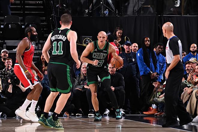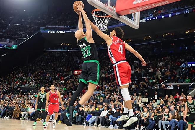 本场比赛中,凯尔特人的替补锋线新星乔丹-沃尔什(Jordan Walsh)的表现算得上是令人刮目相看。沃尔什全场出场29分38秒,投篮7中5,三分线外4中3,得到了13分13篮板2助攻1盖帽的两双数据,其中还包括了6个前场篮板,还有1次失误和1次犯规,正负值也是达到了全场次高的+24。沃尔什在进攻端展现出了全面的得分能力,他的出手次数并不多,但是他却通过各种方式拿下了不少的分数,他在外线投篮方面的手感更是相当不错,而且他在前场篮板争抢方面的积极性也是值得肯定的。沃尔什在防守端的表现同样是可圈可点的,他也是展现出了一名防守大闸应有的水准。沃尔什在本场比赛中算是打出了攻守兼备的表现,这也是球队能够取得一场大胜的关键因素。