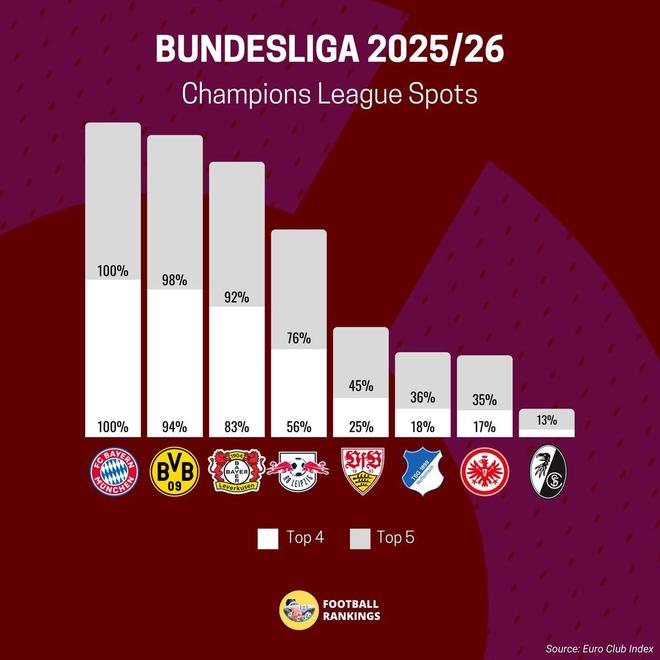 北京时间12月29日,Football Rankings预测了德甲本赛季前四名的概率,拜仁慕尼黑获得下赛季欧冠资格的概率为100%,多特蒙德94%第二,勒沃库森83%第三。