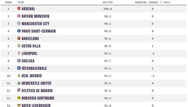 在男足排名中,阿森纳以100分位居第一。皇马目前的评分为93.4分,位列全球第十,在近期排名中有所下滑。
