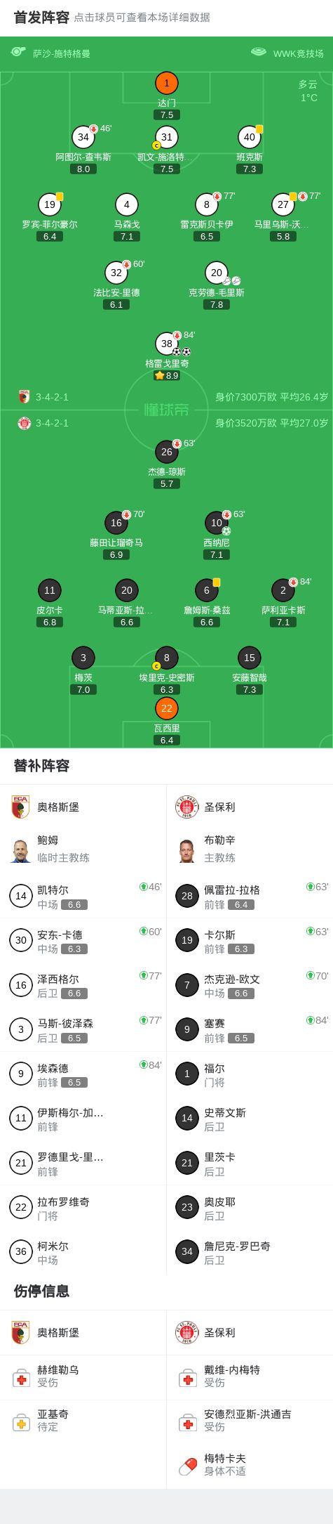 北京时间1月31日德国足球顶级联赛 联赛 第20轮,奥格斯堡主场对阵圣保利。奥格斯堡格雷戈里奇梅开二度。圣保利西纳尼破门。最终比分奥格斯堡 2-1 圣保利。
