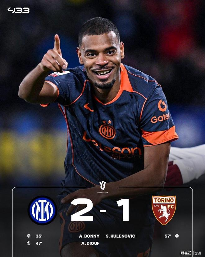 意大利杯1/4决赛,国米2-1击败都灵,晋级四强,将对阵那不勒斯和科莫之间的胜者。博尼先拔头筹,迪乌夫再下一城,库莱诺维奇扳回一球,博尼伤退,普拉蒂进球被吹。