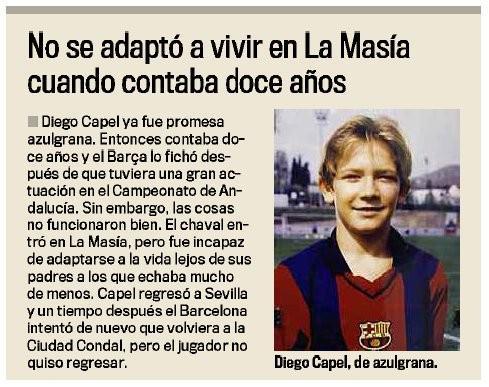 迭戈-卡佩尔1988年2月16日出生于阿尔梅里亚的阿尔波什,出道于家乡球队奥卢拉青训营。2000年时,巴塞罗那从奥卢拉带走了卡佩尔,不过仅仅过了半年,卡佩尔就因为抑郁回到了奥卢拉。此后,卡佩尔还曾在东方体育以及塞维利亚接受过足球培训。