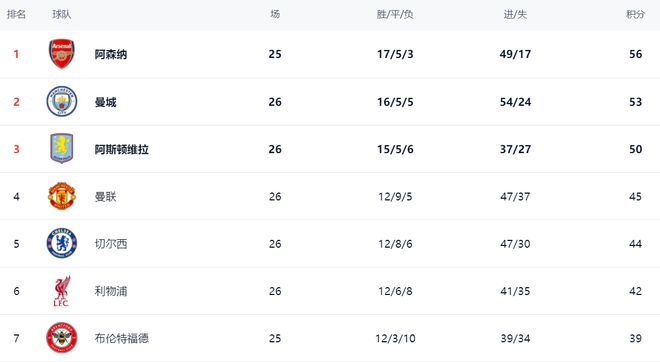 在积分榜上,阿森纳以56分高居榜首,战绩是17胜5平3负。曼城赢球之后,继续紧追阿森纳,只落后阿森纳3分,屈居第2。不过,曼城比阿森纳多踢1场。同样赢球的阿斯顿维拉拿到50分,排名第3,理论上依然有冲击冠军的希望。曼联45分排名第4。第5的切尔西拿到44分,仅仅落后曼联1分。利物浦赢球之后,总积分达到42分,排名第6,缩小与曼联切尔西的差距。争四的形势非常激烈,几支豪门的差距微乎其微。