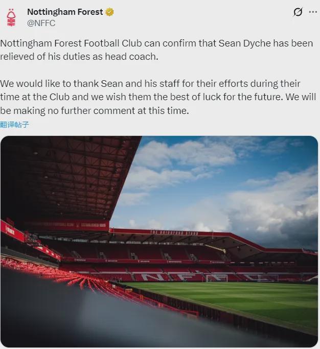 官方:诺丁汉森林宣布解雇了肖恩-戴彻,这名教练仅仅上任了4个月左右。