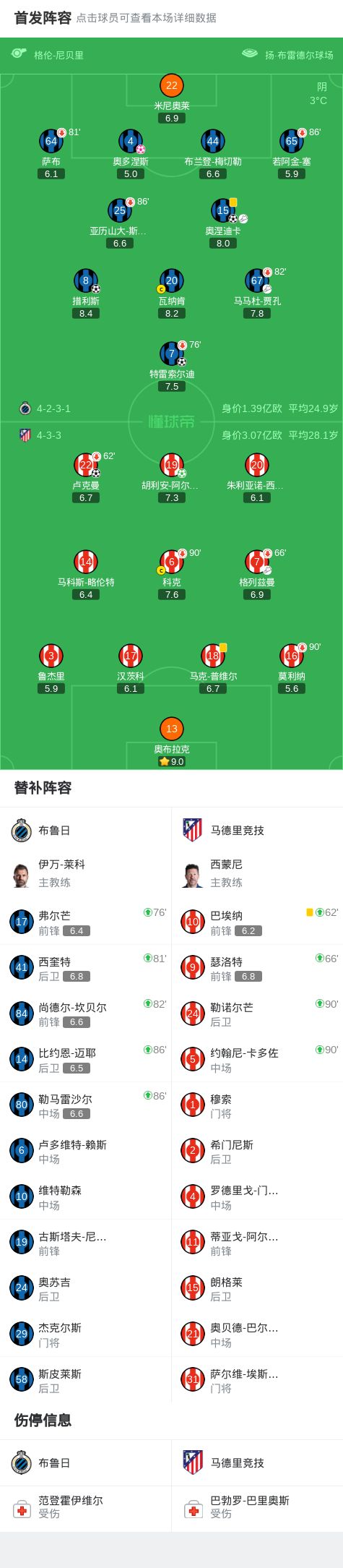 北京时间2月19日欧洲冠军联赛 淘汰赛附加赛首回合,布鲁日对阵马德里竞技。布鲁日奥涅迪卡破门,特雷索尔迪破门,措利斯破门,奥多涅斯自摆乌龙。马德里竞技胡利安-阿尔瓦雷斯破门,卢克曼破门。最终比分布鲁日 3-3 马竞。