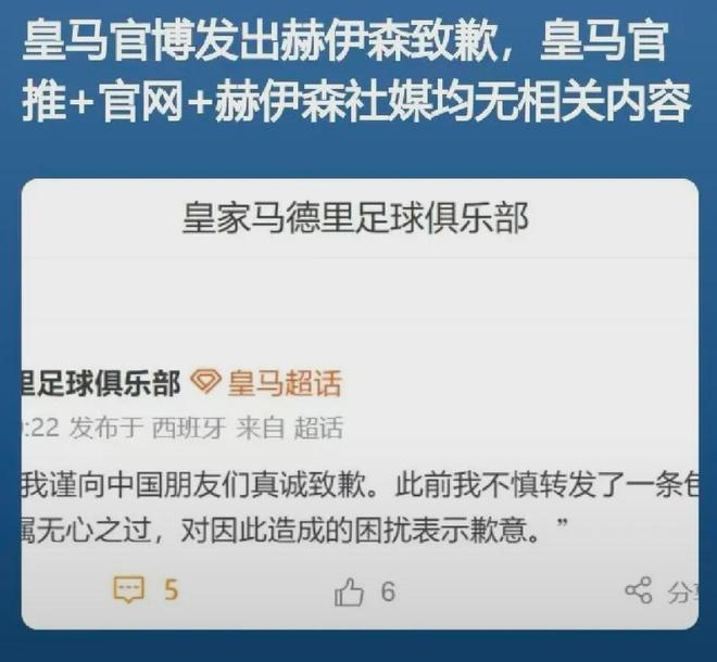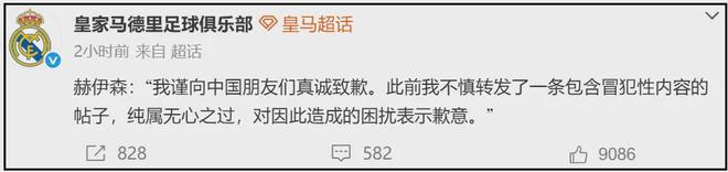 目前,皇家马德里足球俱乐部账号分别在微博和某站发布了道歉动态,内容如下: