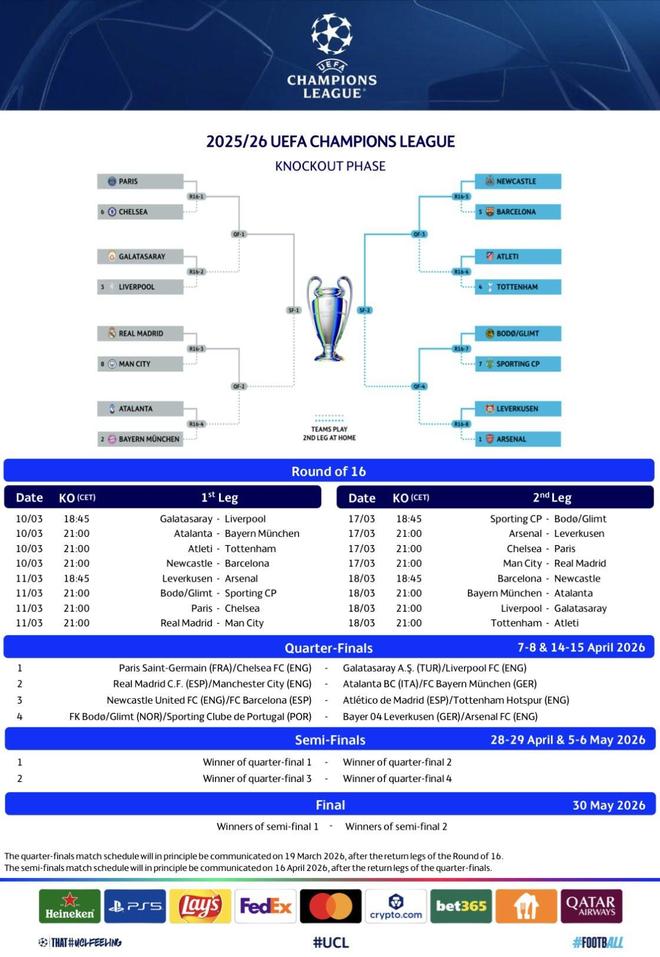 北京时间2月27日,在欧冠淘汰赛抽签结束后,欧足联官方已经确认了1/8决赛全部16场比赛的开球时间。其中皇马与曼城的两回合比赛将分别于北京时间3月12日4:00和3月18日4:00进行。