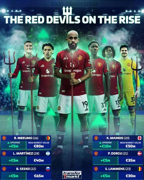 曼联全队身价上涨3500万欧,其中梅努涨1000万欧为涨幅最大