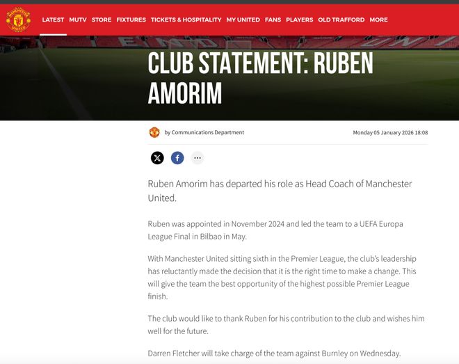 北京时间1月5日,英超豪门曼联俱乐部,官方宣布正式解雇了40岁的主帅鲁本-阿莫林。前中场球员、现任U18主教练达伦-弗莱彻将暂时接任主教练一职。他的首场比赛将是周三晚客场挑战伯恩利,而曼联新帅正式任命,可能要等到夏季才会公布。
