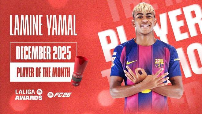 最终评选中,亚马尔击败了姆巴佩(皇家马德里)、巴莱拉(埃尔切)、科克(马德里竞技)以及拉杜(塞尔塔),成功当选2025年12月西甲月度最佳球员。